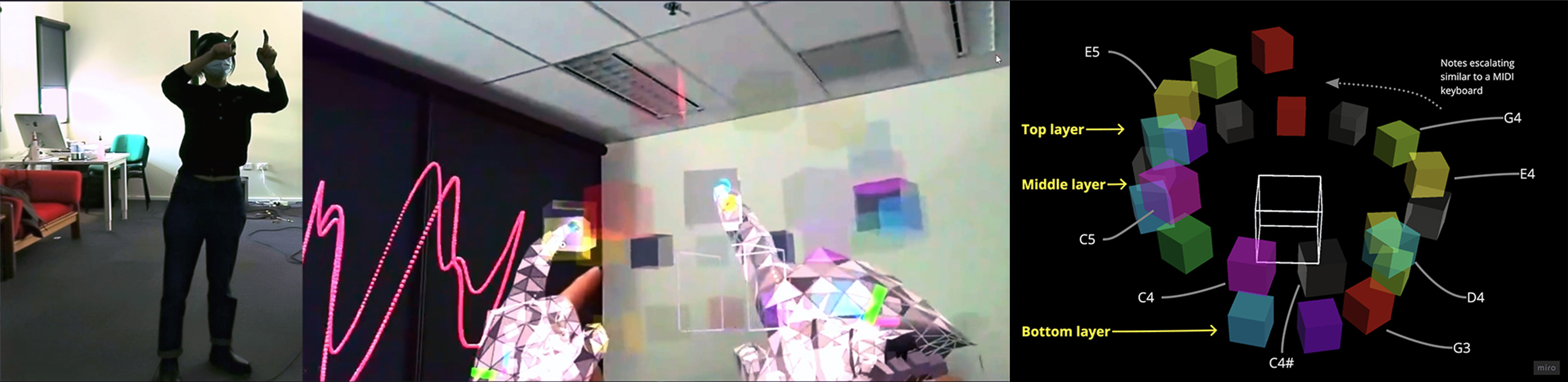 We create authentic spatial musical apps that support interaction in AR/VR computers. We experimented with new freehand gestures in AR and have deployed a spiral-shaped keyboard in collaborative music experiments as well as artistic performances.