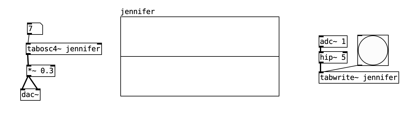 tabread4~ (table read) to play audio data from any point in the arraytabread4~ is like the read head of a tape machine: it just accesses the data, it doesn’t move the tape