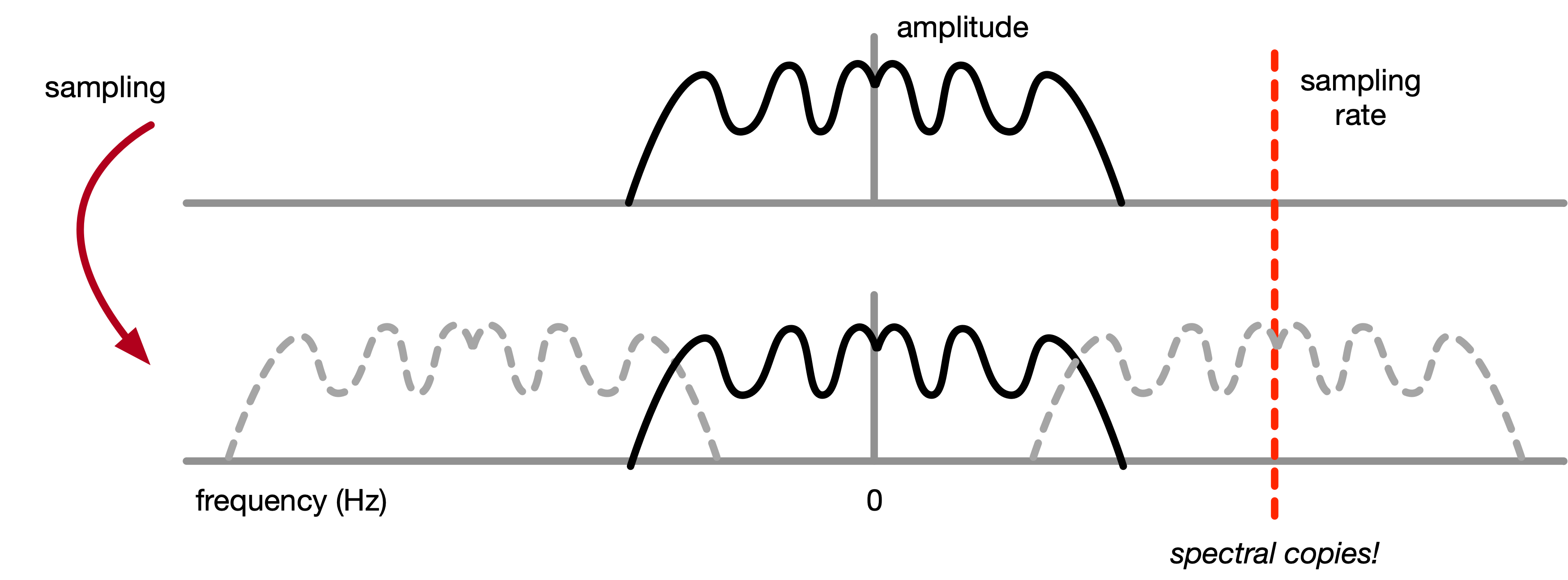 It turns out the spectrum of the signal copied at each multiple of the sampling rate. This is bad because the copied frequencies interfere with spectrum that we want.