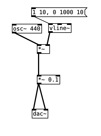 0 1000 10 means “ramp to 0 over 1000ms after 10ms”vline~ with *~ to turn the sound up and down to shape a note.