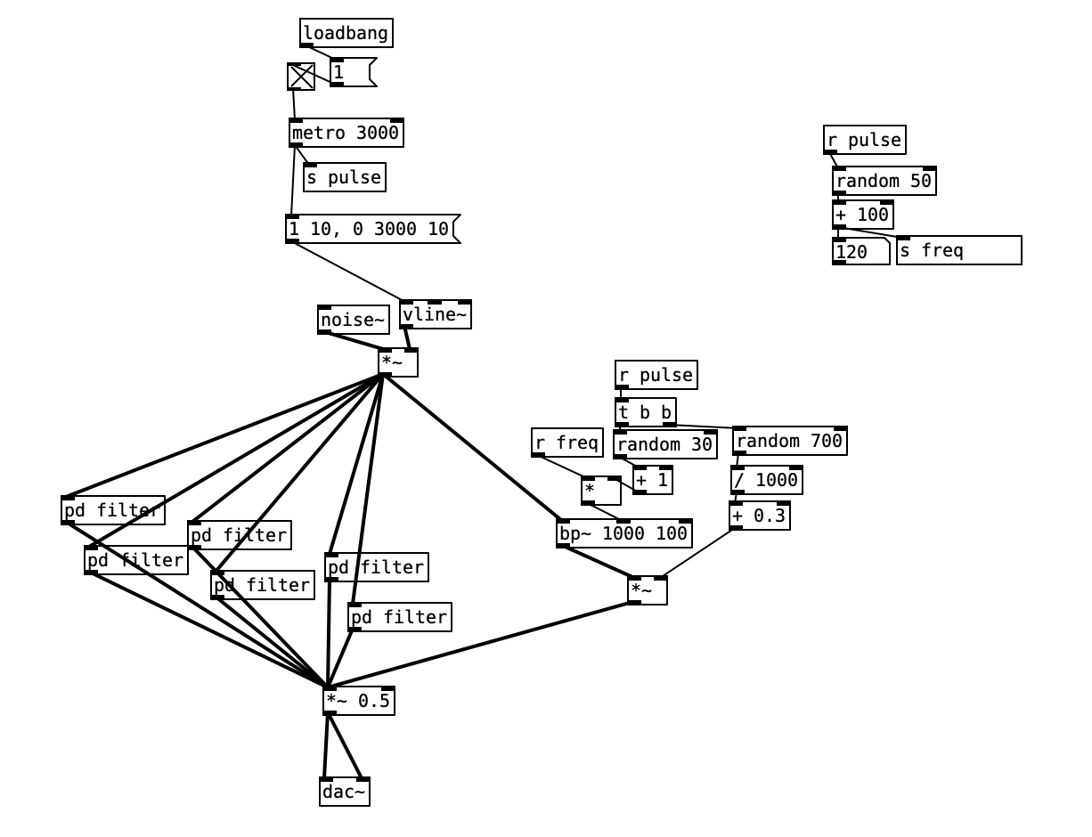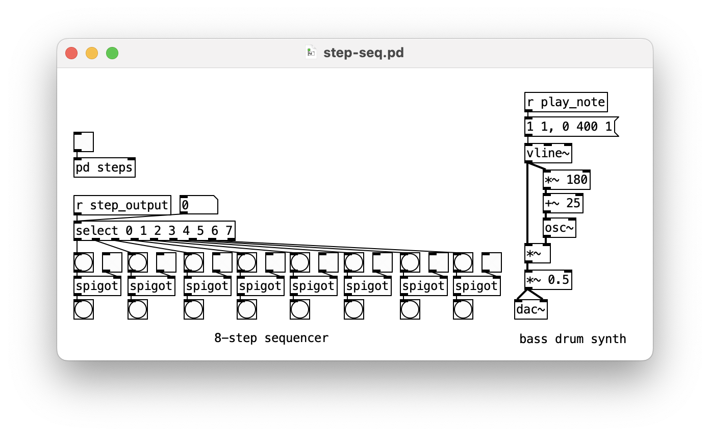 spigot, only passes messages if right inlet is set to 1pd ...) to hide counter logicosc~)Even better: hide drum synth in sub-patch, use graph-on-parent to hide sequencer logic except for toggle boxes.