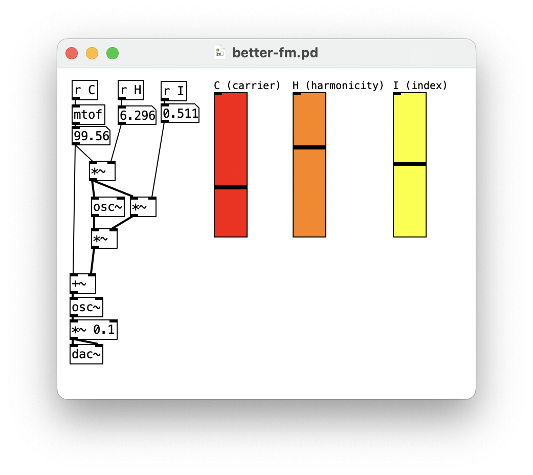 Note in the patch that the carrier oscillator is split up into a phasor~ and cos~ operator.
