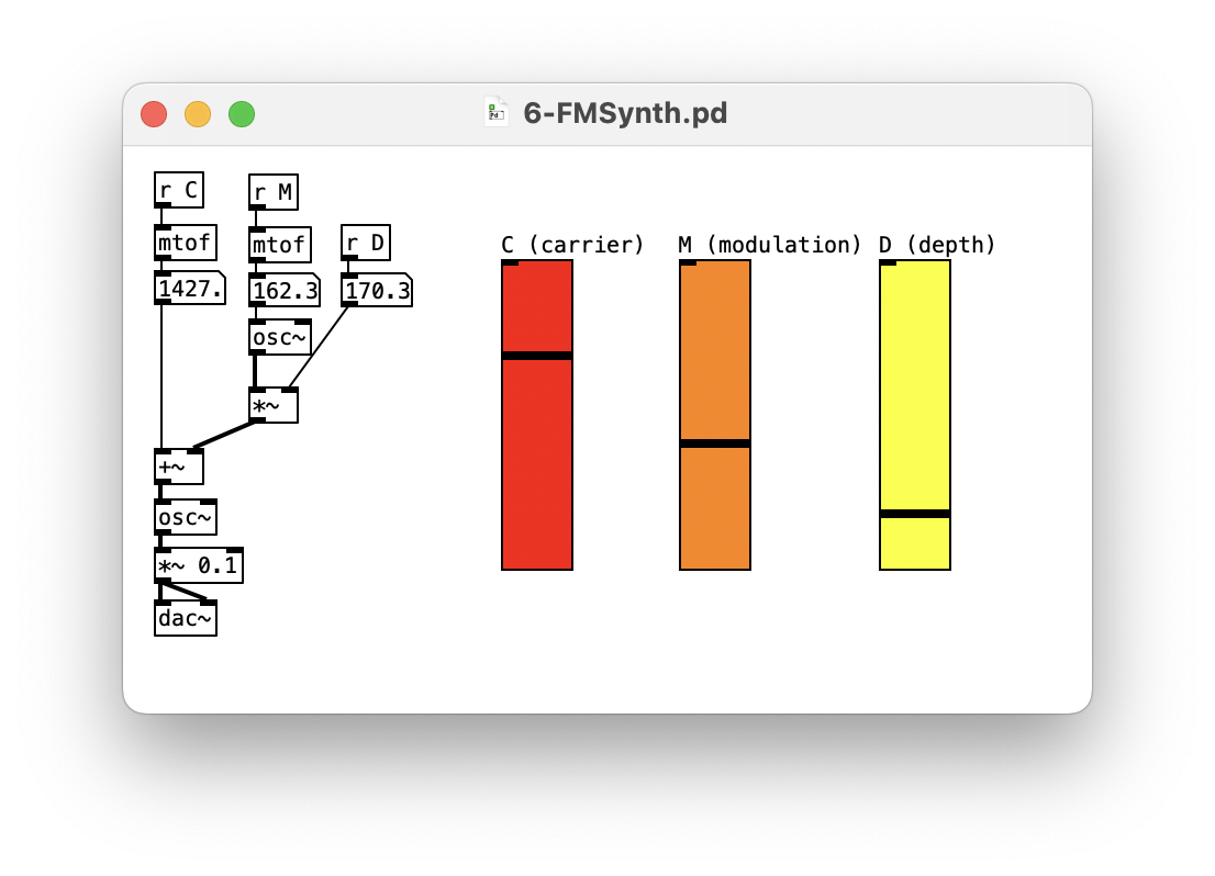 Three parameters: C the carrier frequency, M the modulation frequency and D the depth of modulation.